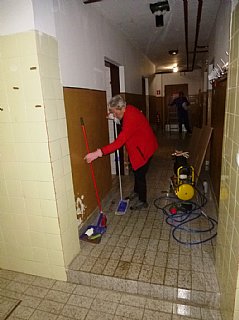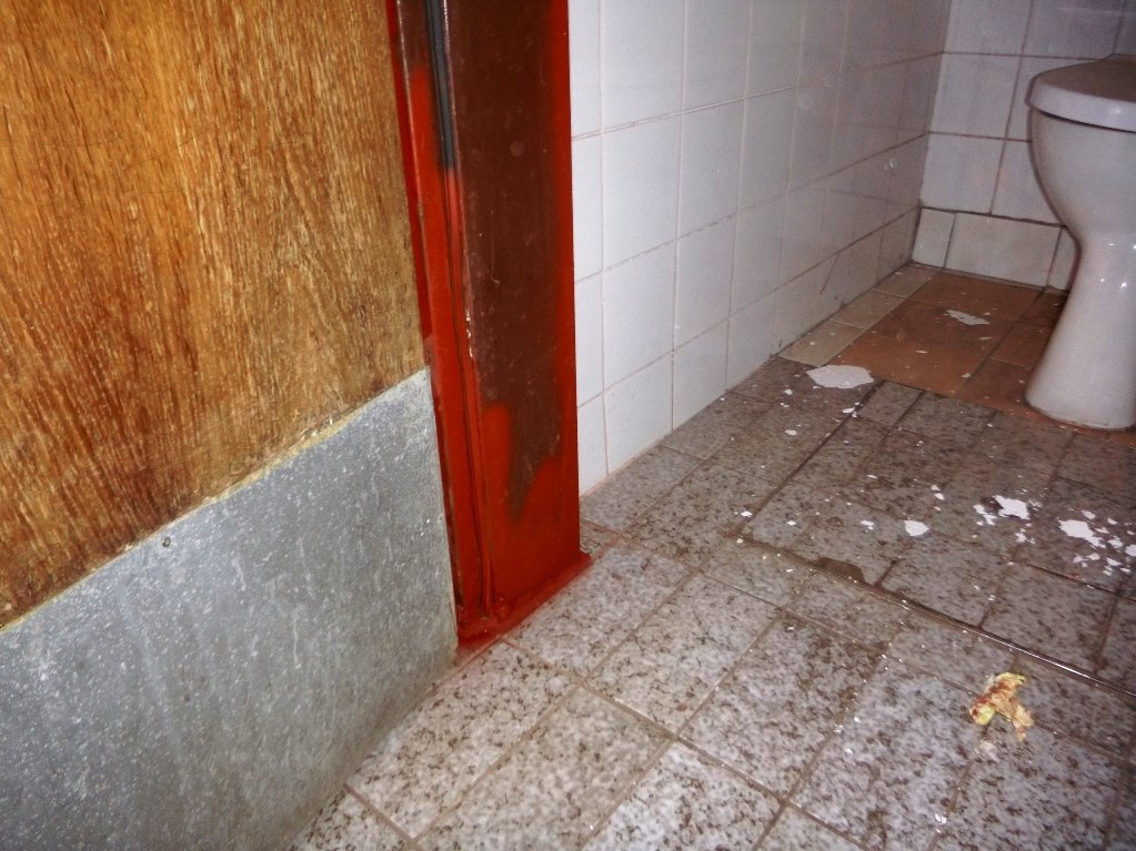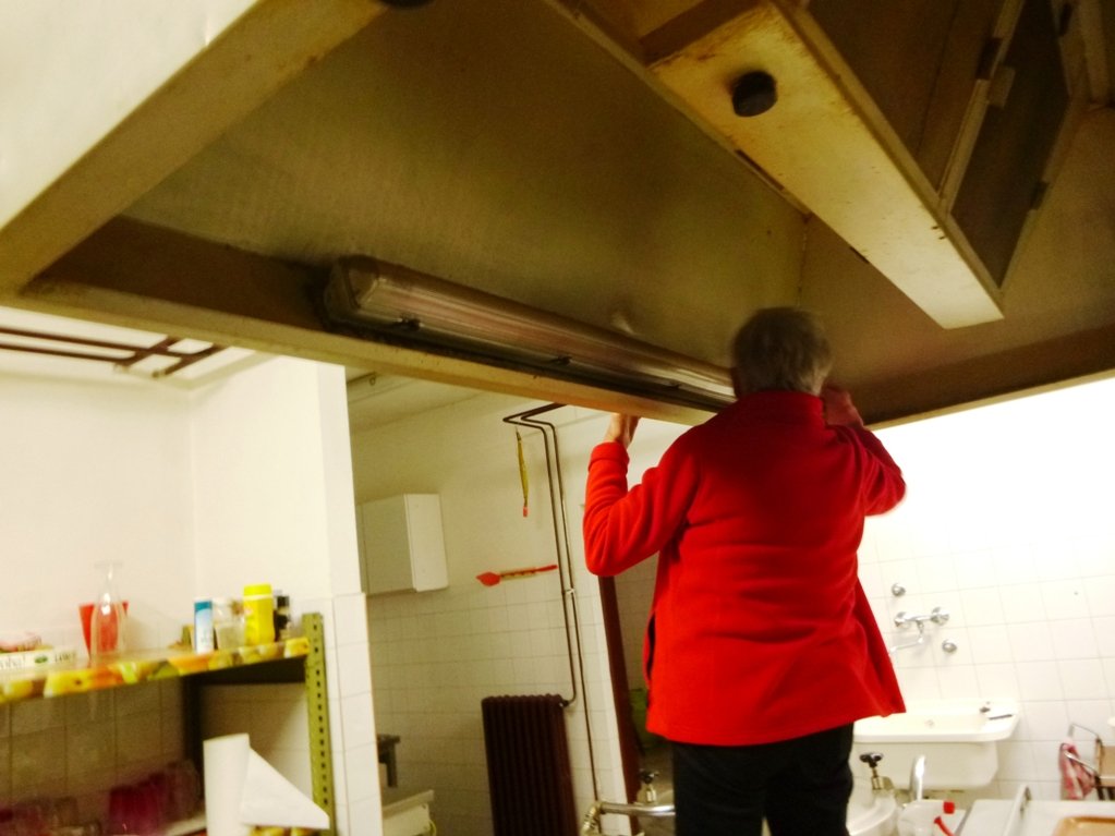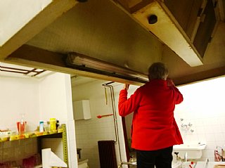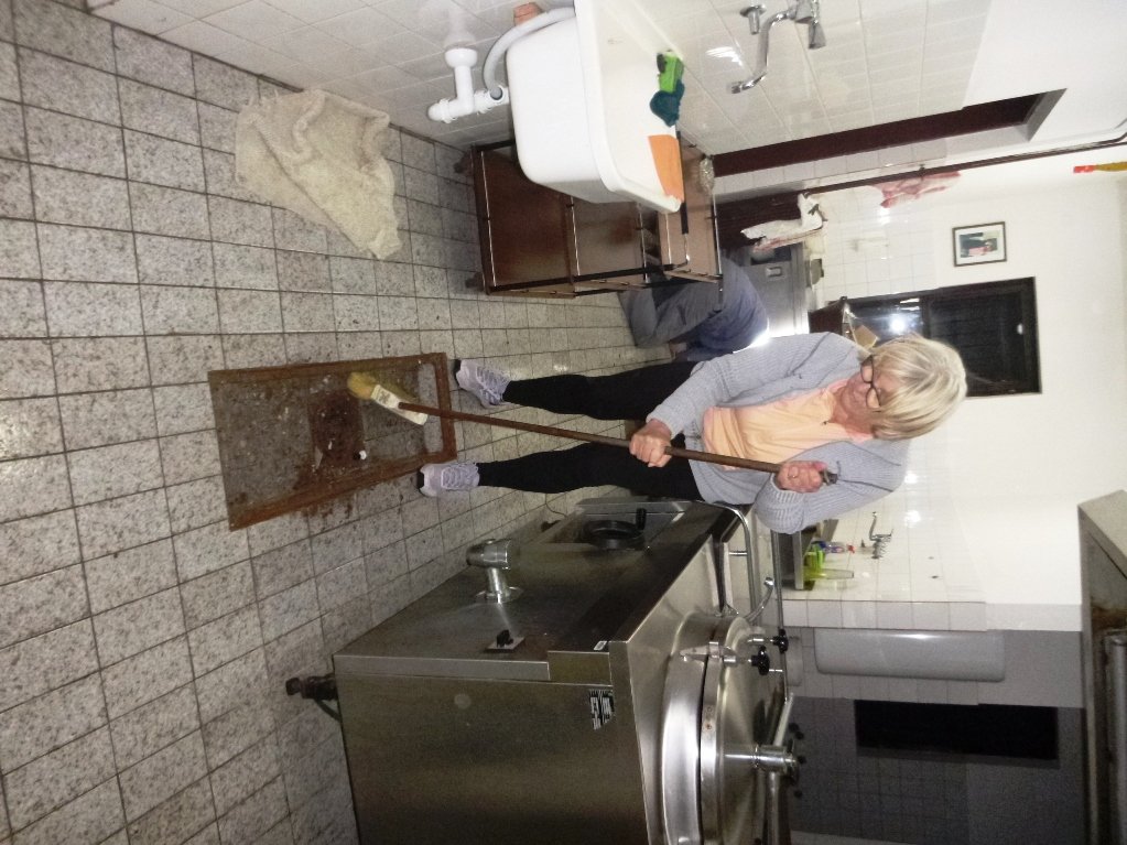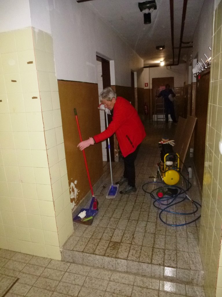 Speskali in prebarvali smo spodnje dele skoraj popolnoma prerjavele kovinske podboje straniščnih vrat in kopalnice, zamenjali pregorele žarnice in zamenjali potrebna stikala, popravili vrata v spalnice, zlepili kar nekaj lesenih stolov, v kuhinji počistili desetletno umazanijo pod štedilniki in kotli, delno očistili napo, demontirali sifonske rešetke, zavarili manjkajoče prečke, očistili debelo rjo okvirjev rešetk in jih temeljno pobarvali, z muko odprli totalno zarjavele sifone, jih zbrusili in temeljno prebarvali, zamenjali straniščne deske in jih učvrstili ter ves kuhinjski, sanitarni in vhodni del počistili.