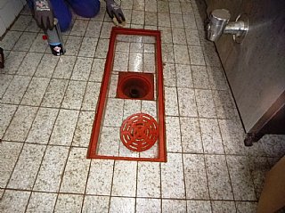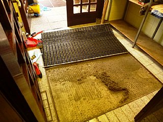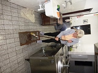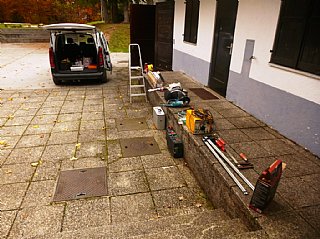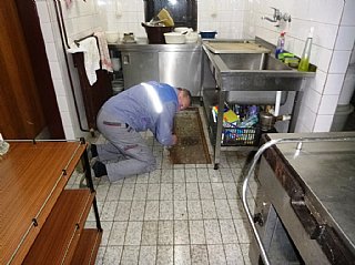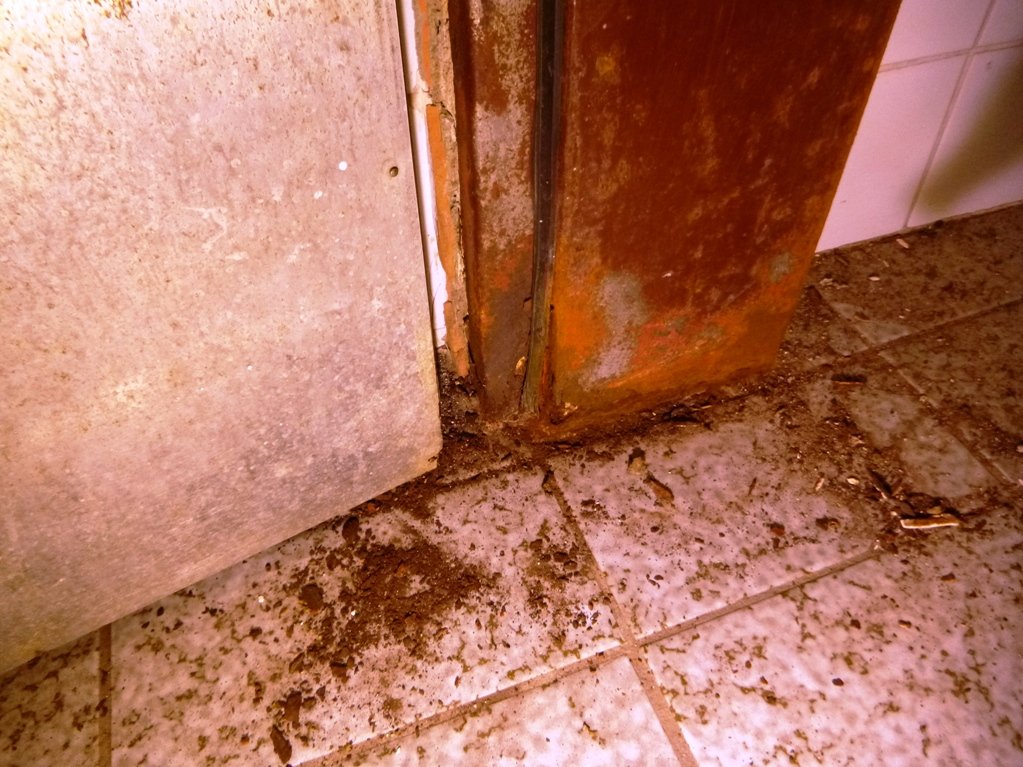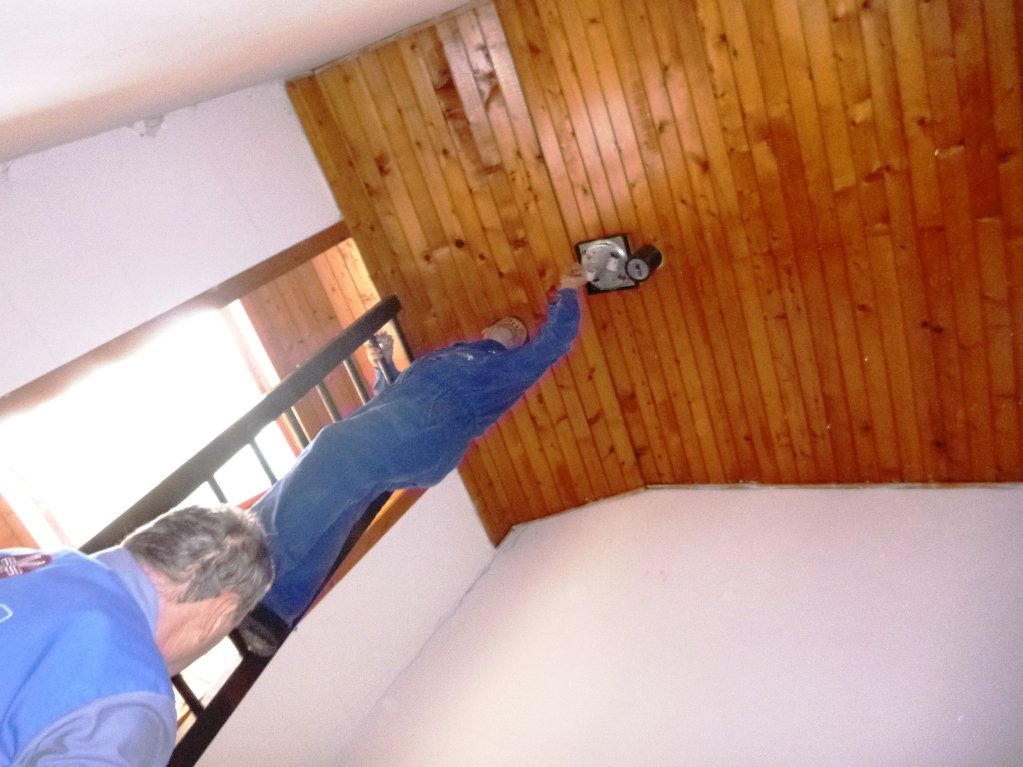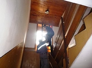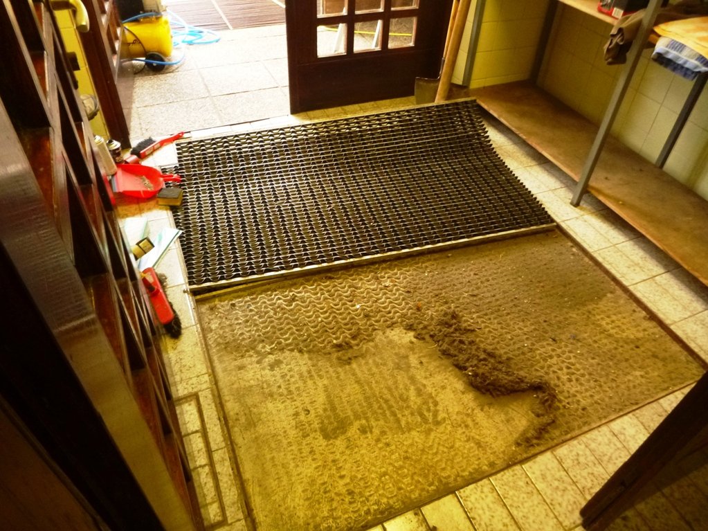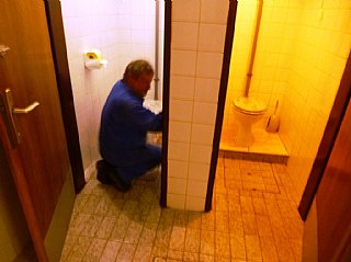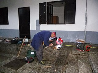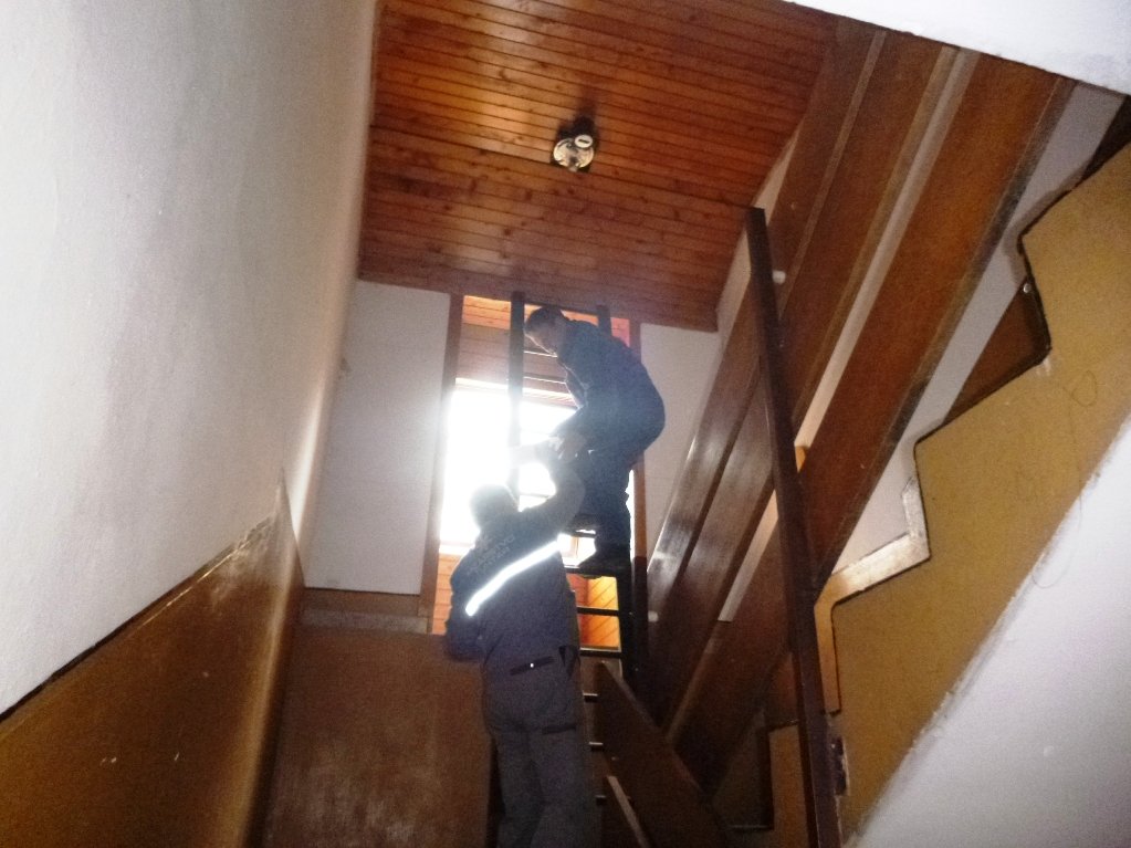 Speskali in prebarvali smo spodnje dele skoraj popolnoma prerjavele kovinske podboje straniščnih vrat in kopalnice, zamenjali pregorele žarnice in zamenjali potrebna stikala, popravili vrata v spalnice, zlepili kar nekaj lesenih stolov, v kuhinji počistili desetletno umazanijo pod štedilniki in kotli, delno očistili napo, demontirali sifonske rešetke, zavarili manjkajoče prečke, očistili debelo rjo okvirjev rešetk in jih temeljno pobarvali, z muko odprli totalno zarjavele sifone, jih zbrusili in temeljno prebarvali, zamenjali straniščne deske in jih učvrstili ter ves kuhinjski, sanitarni in vhodni del počistili.