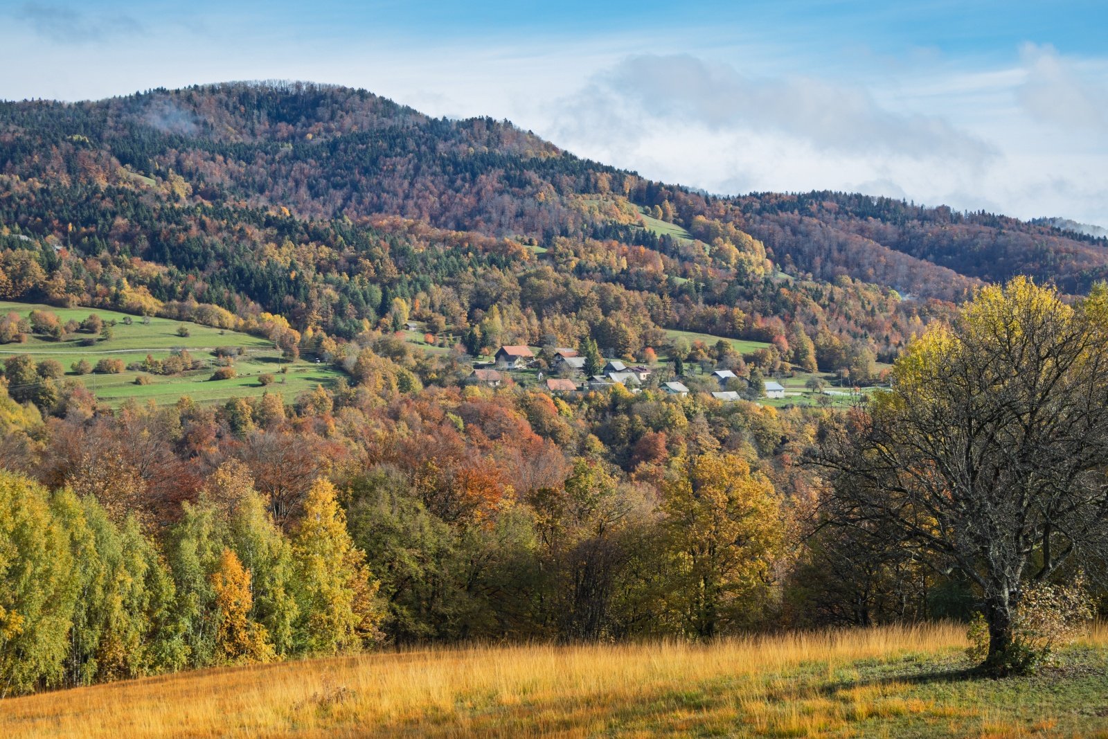 ter z grebena pogledujemo proti naselju pod nami in proti Cerkvi svetega Roka. Na najvišji točki se malo podpremo s tekočimi in trdimi dobrotami,